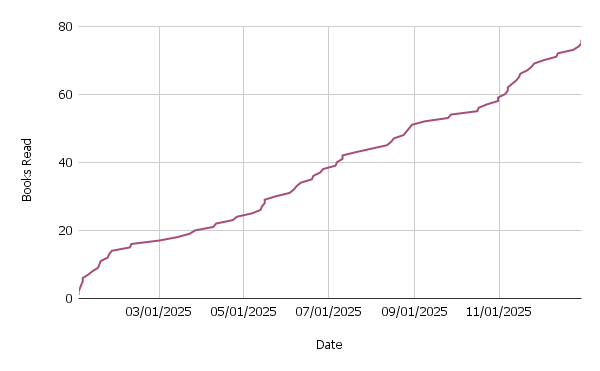 In 2025, I read 76 books, exactly one more than my target and 18 more than 2024.1 That’s about 6.33 books per month, but my actual reading habits varied widely. I finished the most books in January (15) and the least in February (2).