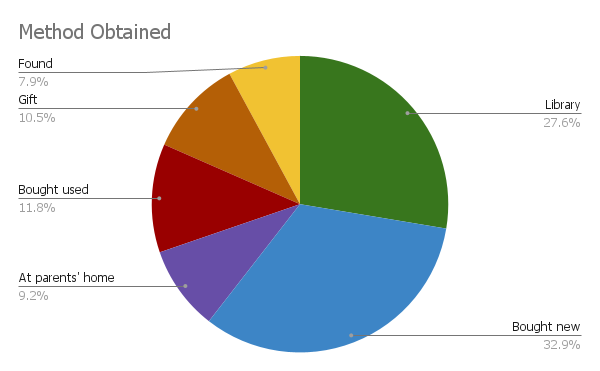 Most of those 18 nonfiction books came from MIT’s library system, which was the second-highest contributor to my reading list this year. Overall, I bought a lot more books new than I probably should have, but that was still less than a third of the total thanks to the library, the exceptional used bookstores and sidewalk shelves of Cambridge/NYC/Burlingame, and the wonderful family and friends who lent or gifted me books. Also, I read mostly physical books (67 out of 76), but I was grateful for my Kindle while in California.