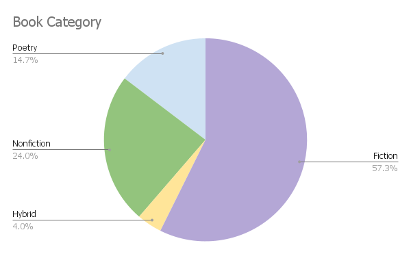 At the beginning of the year, I said I wanted to read 25 nonfiction books, so I’m a little disappointed that I got off track. I also wish I had read more plays. However, I’m quite pleased with my poetry reading, a lot of which is not reflected by this chart (yay class and Google!), and feel eh-to-good about the fiction.